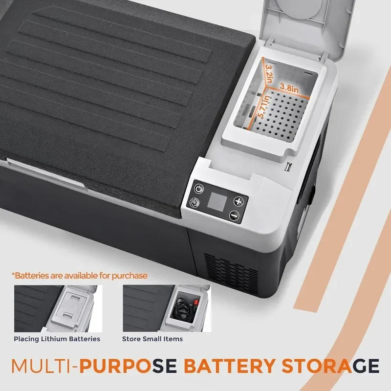 - Independent Space & Battery Usage: Our 12V refrigerator features a unique space bin, designed as a multi-functional storage area for AC/DC power cords, small tools, and other essentials, preventing loss. If you purchase additional batteries, the space bin can function as a battery power/charging compartment (the battery lasts for 6 hours after a full charge), and the 12V Cooler supports unplugged wireless use, allowing you to enjoy the convenience of a wireless design (Batteries sold separately)