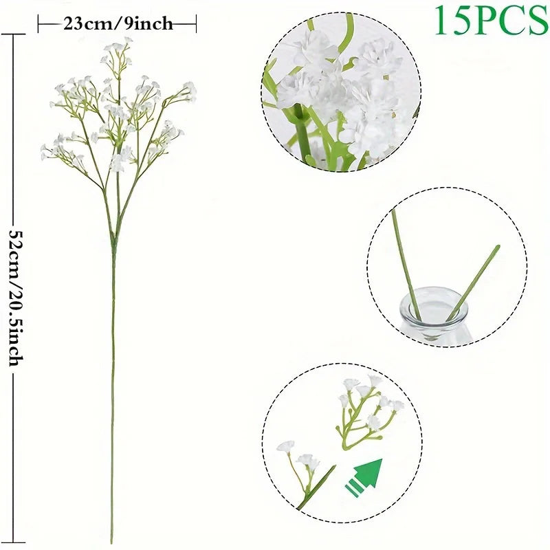Add a touch of elegance to your event or home decor with these 15 pieces of artificial baby's breath flowers. Made with precision and high-quality materials, these delicate flowers provide an enduring beauty that is sure to impress. Perfect for weddings, parties, and everyday use.