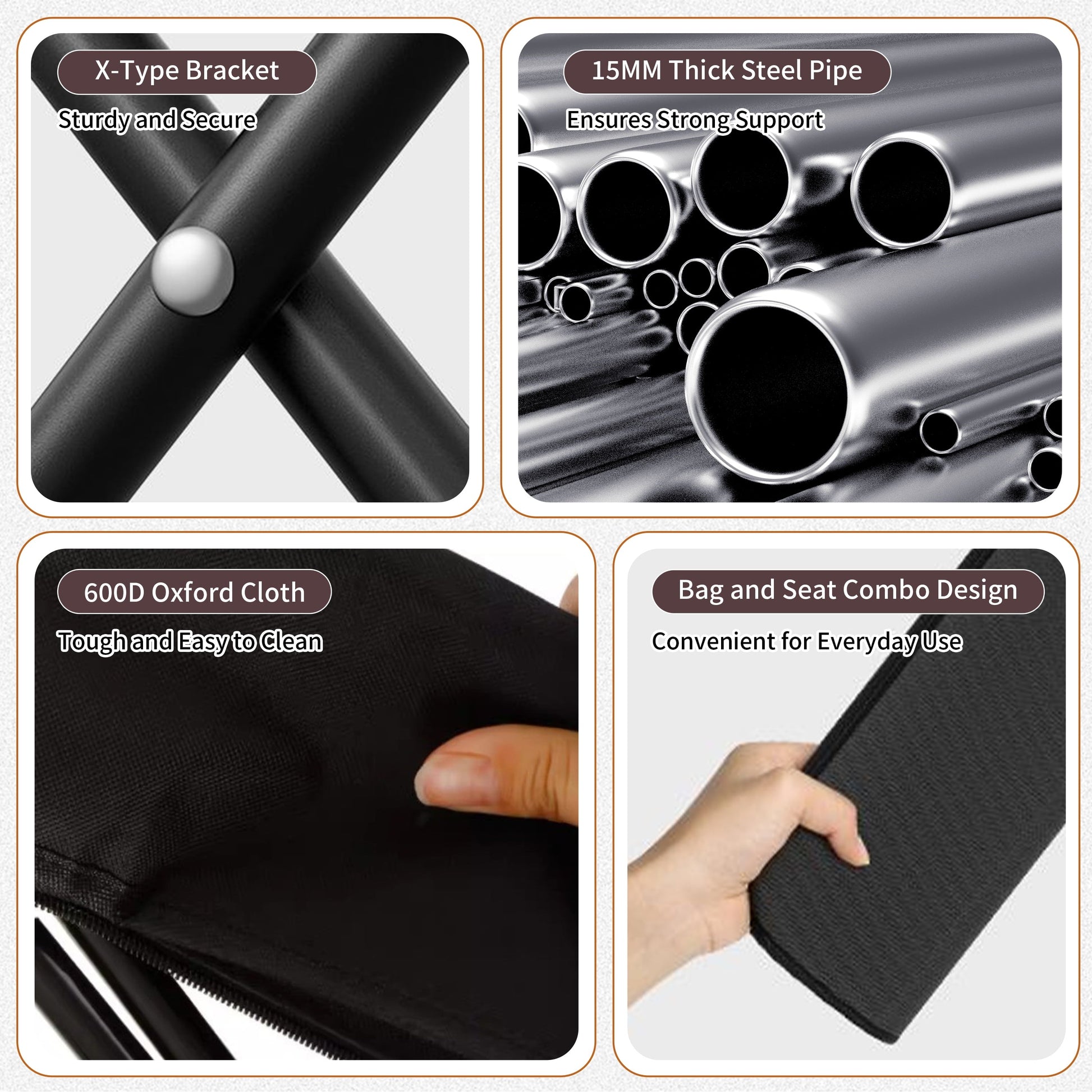 - 🛠️ Heavy-Duty Steel Frame for Strong, Stable Support: Built with a reinforced steel frame and tough wear-resistant fabric, these folding camping stools hold up to 220 lbs with ease. The cross-braced leg design adds extra stability on uneven terrain, making them dependable for all-season outdoor use. The seat resists tearing and sagging, so you can trust these stools for everything from outdoor cooking to riverside fishing. Ideal for durable outdoor seating wherever your adventures take you. 🧱