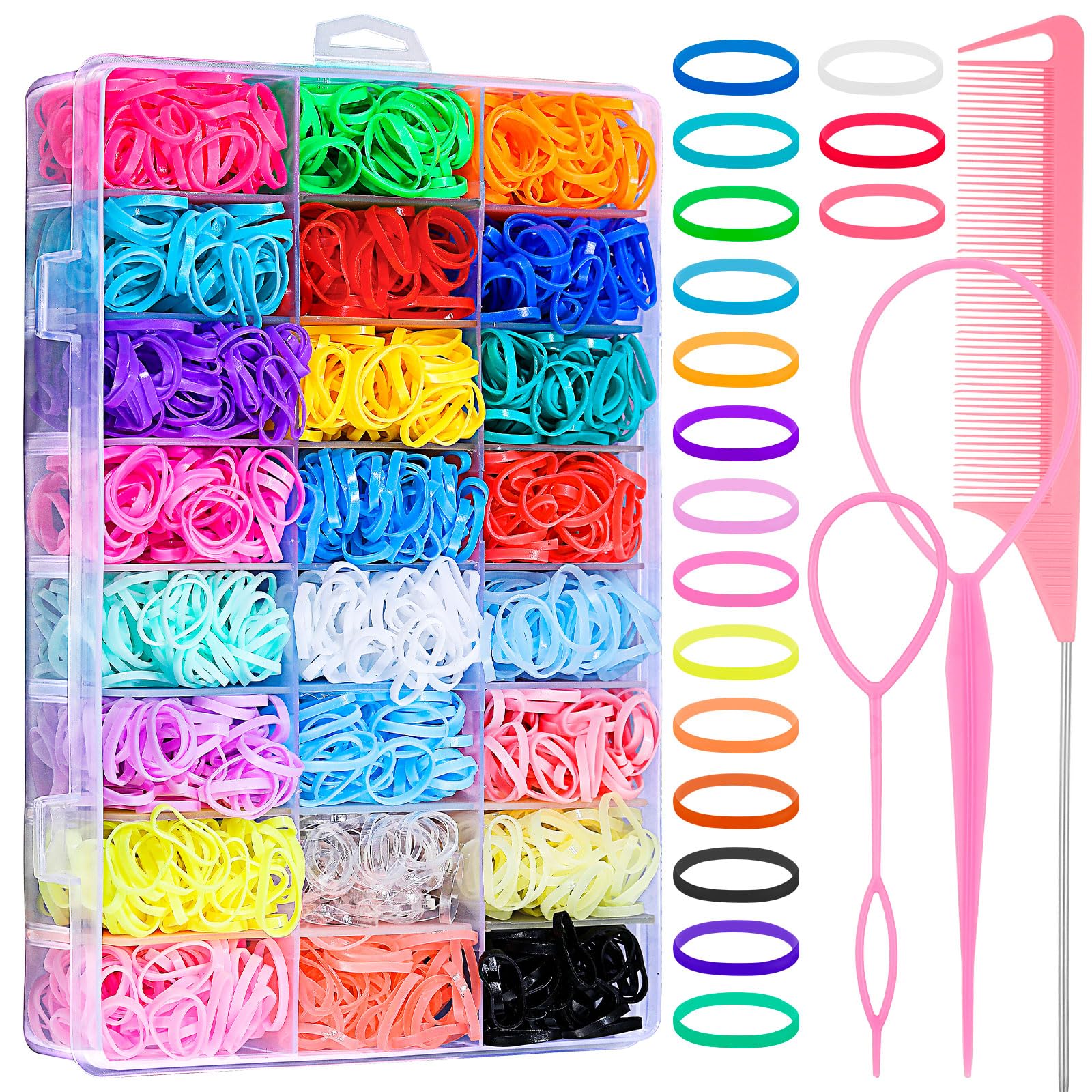 - Package Includes: The package includes 2200pcs rubber bands for hair, 2 tospy tail hair loops, 1 rat tail comb,suitable for all kinds of hair, such as curly hair, straight hair, long hair, short hair, etc