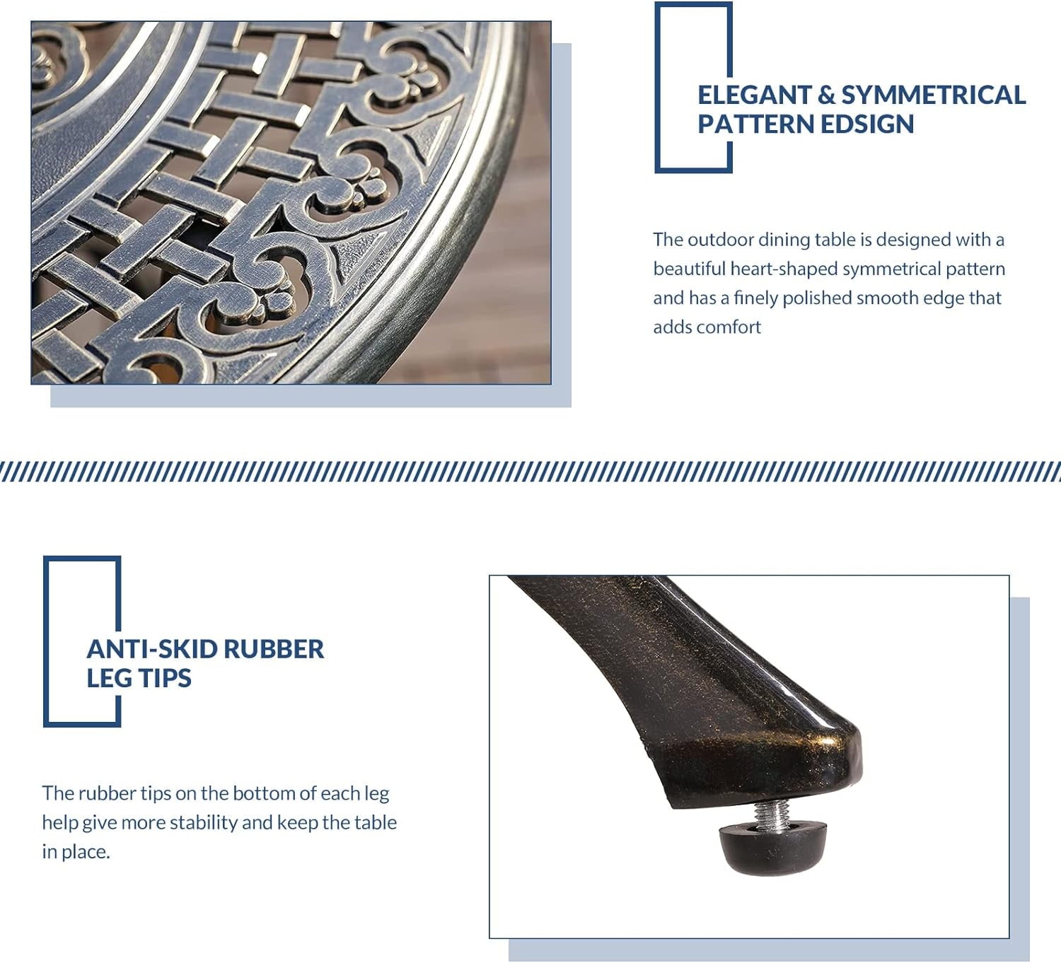 This intricately designed cast aluminum outdoor dining table seats up to four guests and is an elegant addition to your back yard or patio. Cast Aluminum provides a durable, all-weather surface so you can leave the table outdoors and host your family and friends any time of year.