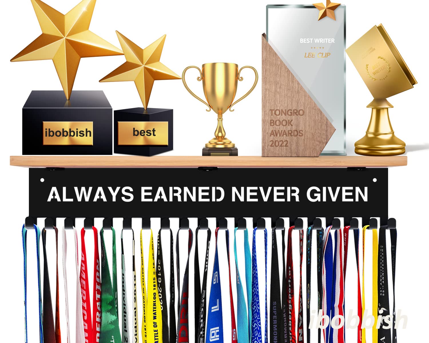 ALWAYS EARNED NEVER GIVEN Trophy and Medal Hanger Display Shelf,Soccer Trophy Shelf with 20 hooks for Medals,Sturdy Soccer Trophy Shelf in Black Metal Wall Mount Over big Medals Trophy Display Shelf