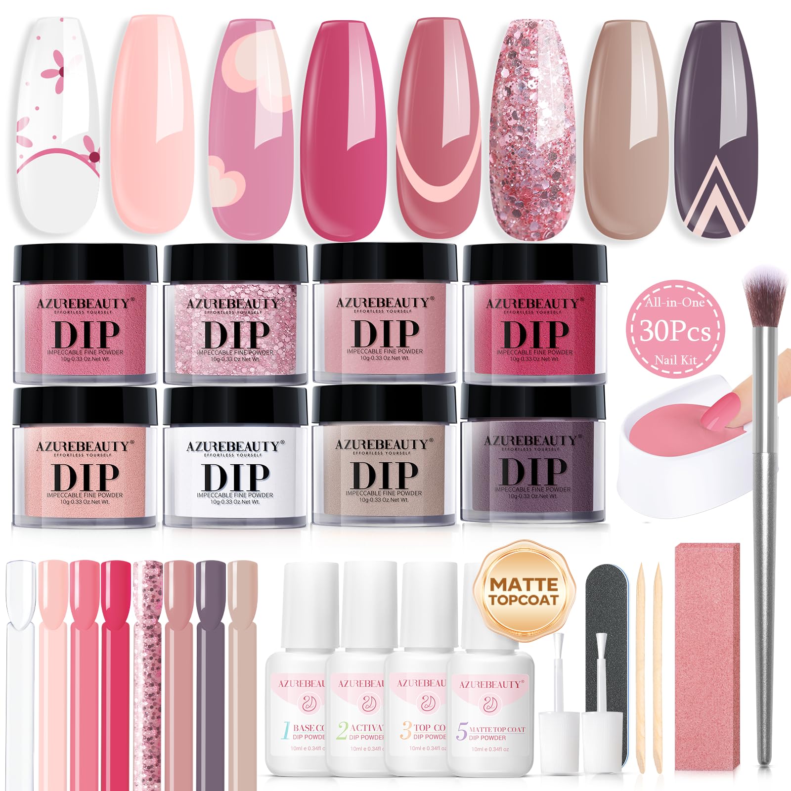 - 【Upgraded 30Pcs Starter Kit】Up to 30 Pcs comprehensive dip nails powder starter kit contains: 8*10g (0.33oz) color powder, 4*10ml dip powder liquid set(base coat/activator/top coat/matte top coat), 2*liquid brush replacement, 1*nail brush,1*nail file, 1*nail polishing block, 1*dip powder recycling tray. 🎁What's more, 10*nail sticks and 2*orange wood stickers are added in the kit for color testing as well as ease of use.🎁