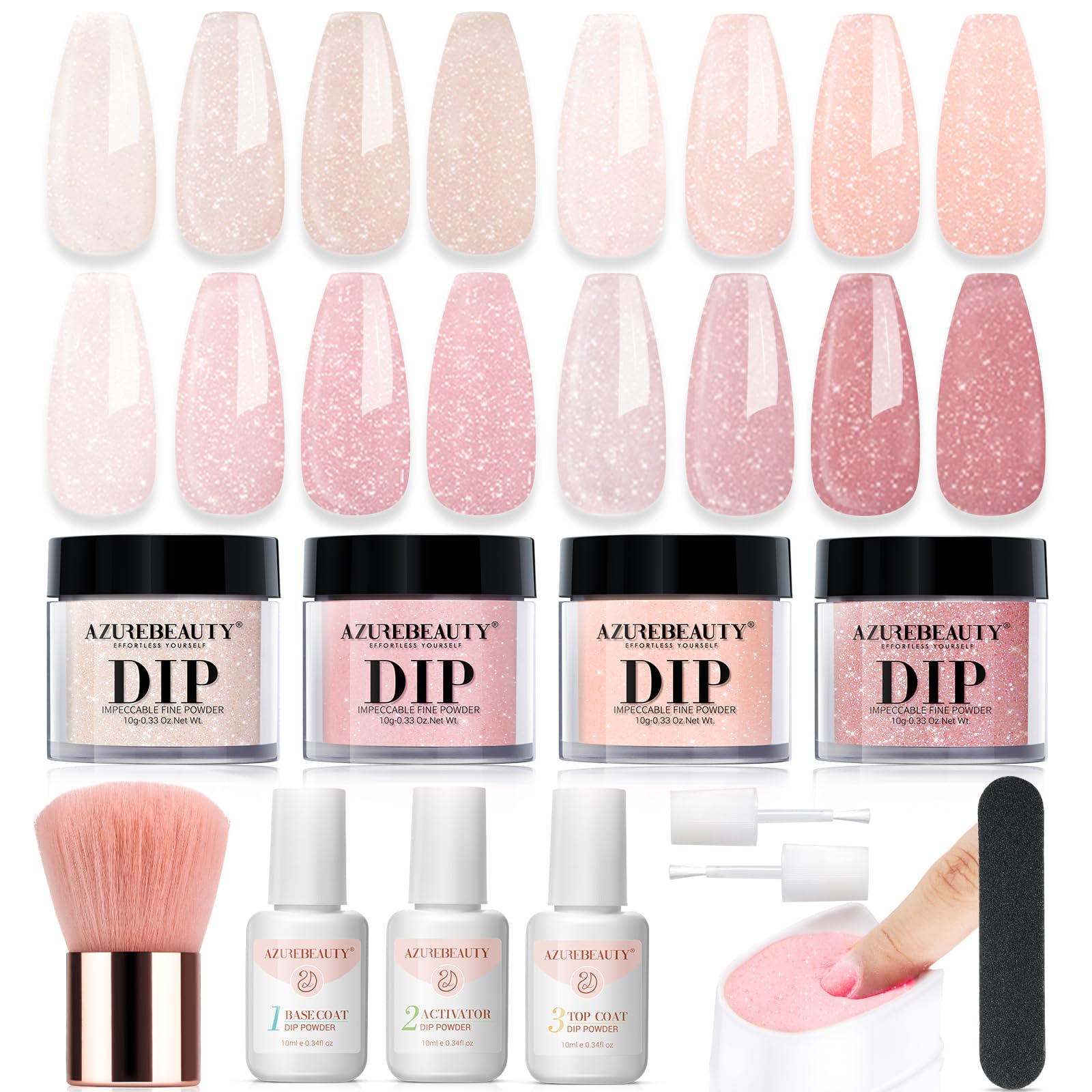 - 【Essential Choice for Beginners】 AZUREBEAUTY 12 Pcs Complete Nail Dip Powder kit was developed especially for beginners, for a small fee you can get a complete dipping powder kit, Including 4*10g Translucent Jelly dip powder Set with nude glitter、pink glitter、peach glitter、sand pink glitter, 3*10ml liquid set (base coat/activator/top coat), 2*liquid brush replacement, 1*nail brush,1*nail file, 1*dip powder recycling system, User Manual Quick Start Guide