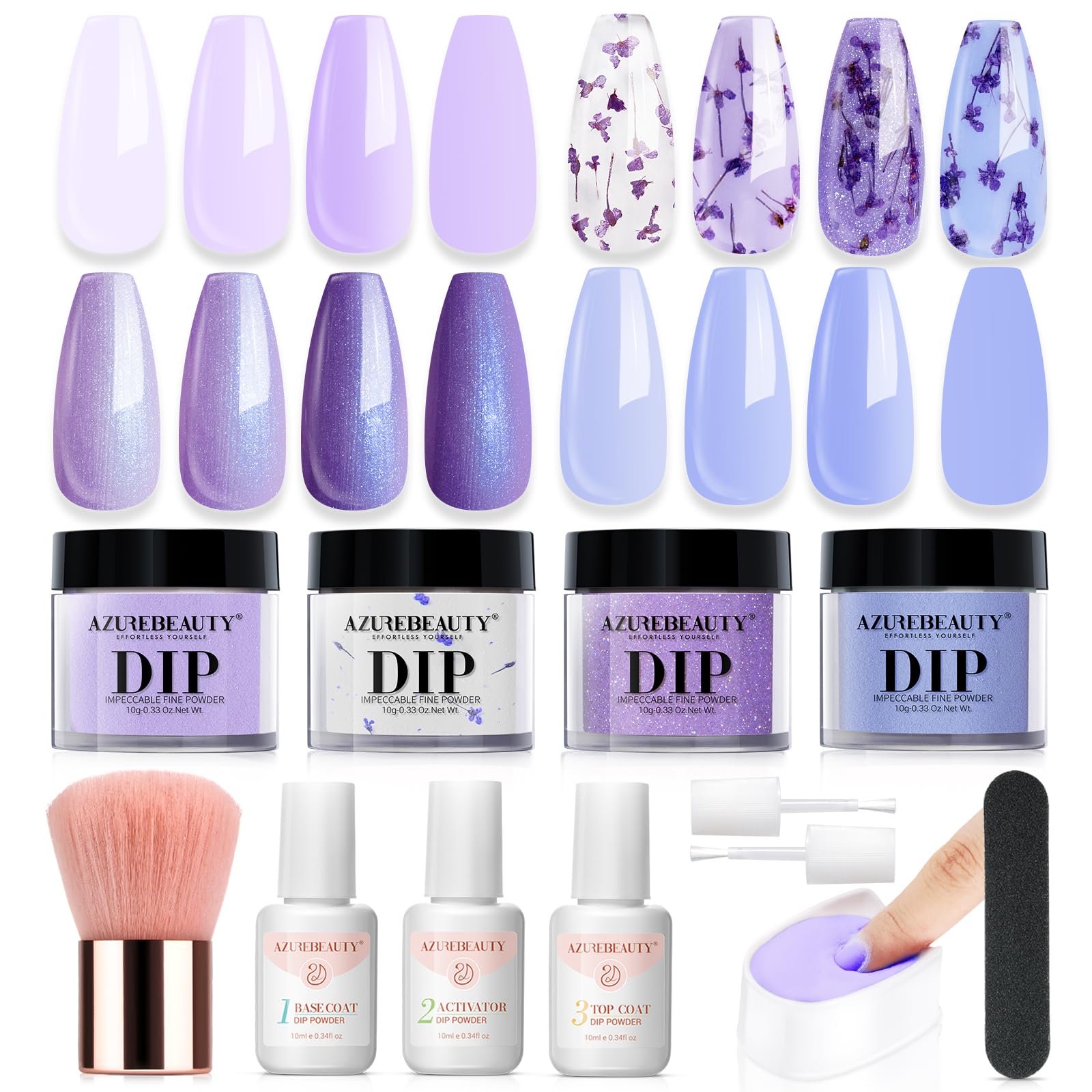 - Floral Dip Powder Kit: AZUREBEAUTY 12 Pcs Nail Dip Powder Kit, designed for beginners. Includes 4 x 10g powders in purple, blue, sparkling purple, and dip dried flowers (*dried flowers added to the powder), 3 x 10ml liquid set (base coat, activator, top coat), 2 liquid brush replacements, 1 nail brush, 1 nail file, 1 dip powder recycling system, and user manual with quick start guide