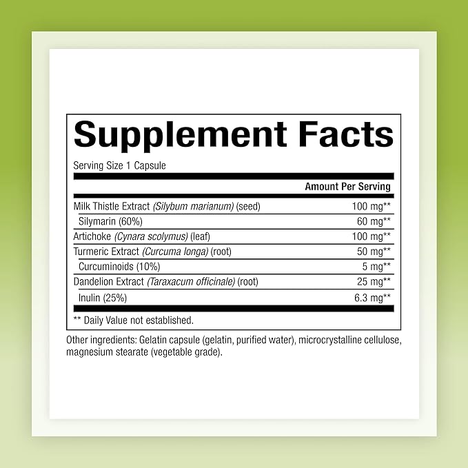 - Milk thistle, turmeric, dandelion and artichoke work together to support daily liver and gallbladder function, help eliminate natural body toxins and promote healthy bile flow*
