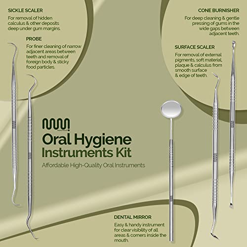 - SURGICAL GRADE DENTAL CLEANING KIT FOR AT-HOME CLEANING: Designed for utmost value, the professional pack includes 1 mouth mirror, 1 dental scaler, 1 sickle scaler, 1 tongue scraper, 1 cone burnisher and 1 probe. Suitable for dentists, hygienists and personal use, this equipment kit is a must-have for all. It also helps in keeping teeth healthy between dental visits