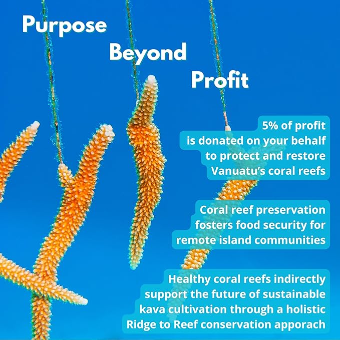 - A Brand with Purpose: With every purchase, you’re not just choosing an exceptional relaxation aid but supporting a greater cause. We donate 5% of profits towards coral reef restoration in our kava sourcing regions, fostering environmental sustainability and food security for remote island communities.