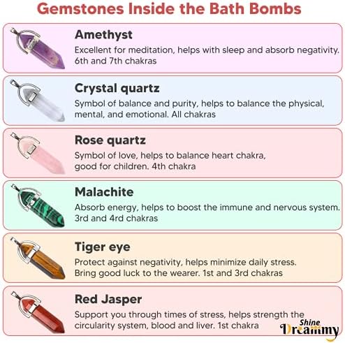 - BATH BOMBS WITH GEMSTONES INSIDE: 6 large 4.2 oz. colorful bath bombs with a natural GEMSTONE surprise inside each bath bomb. Natural gemstones are Amethyst, Tiger eye, Crystal, Rose quartz, Red jasper and Malachite. There is a chain/cord in the box to hang the gemstones right away