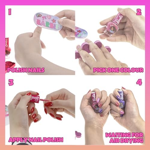 - KIT INCLUDES : Train Case Includes 2 Purple And Pink, Glittery Toe Spacers. 1 Lip Tube: Rose Glitter (strawberry Flavor). 2 Lip Balm: Blue Shimmer (Blueberry Flavor) Rose Shimmer (Strawberry Flavor). 3 Peelable Nail Polishes: Peach Shimmer, Purple Shimmer, Pink Shimmer (Bubble Gum Scented). 1 Nail File W/ Barbie Art On Front. 3 Eye Shimmers: Rose Glitter, Blue Glitter, Gold Glitter. 3 Lip Gloss: Teal Glitter, Light Purple Glitter, Rose Glitter (Candy Flavor). See Description for more info