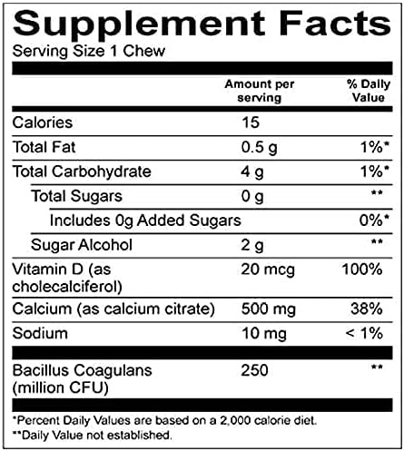 - Each calcium citrate soft chew has 15 calories and no sugar or fat. Each chew has 500 mg of calcium citrate, 800 IU of vitamin D, and 250 million CFU of probiotics.