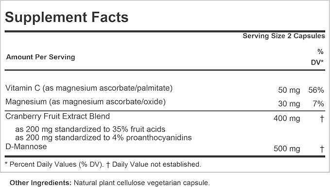 - Superior pure bio-active ingredients - Provides highly concentrated Cranberry fruit extract blend and pure, non-GMO D-Mannose, which is not readily available from the diet. Contains no Milk / Dairy Free, Gluten Free; no soy, yeast, wheat, sodium, salt, cholesterol, color, preservative, common allergens or manufacturing additives.