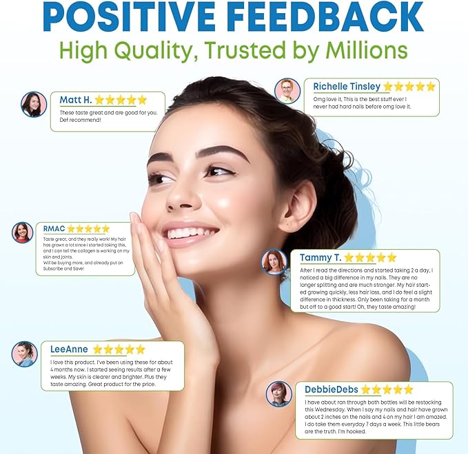 - Get All-round Health Benefits Start With Bite-Sized Gummies: The biotin collagen gummies help nourish your skin for a gorgeous, healthy-looking glow, strengthen nails and promote fuller-looking, luxurious hair, enhance antioxidants, boost immune system & energy