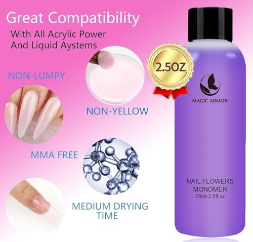 - ๐๐ใWide Range Of Applications ใThis acrylic liquid monomer is formulated with UV stabilizers to ensure color clarity and prevent yellowing or dulling.You can use this acrylic nail kit to DIY, nail extension, adhesive gel, nail carving and etc.And with acrylic powder for nail extension, sculpted acrylics,adhesive nail gems,applied over natural nails for added strength.