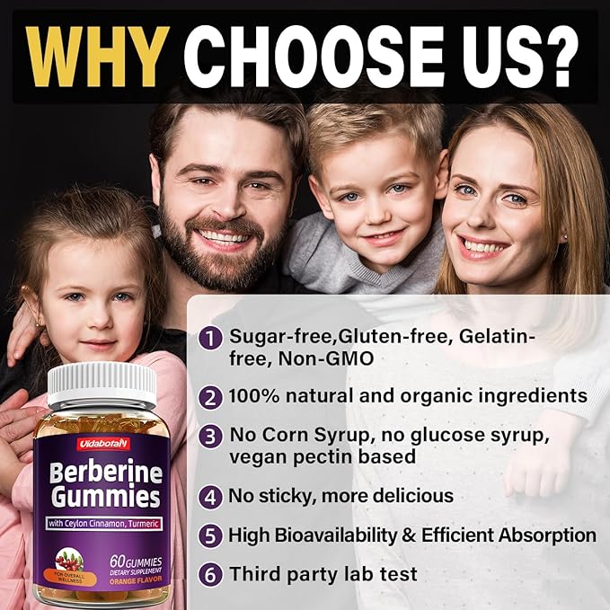 - [Vegan, Gelatin Free, Sugar free]: Each bottle of Vidabotan Berberine gummies made of 60 vegan, all natural, non-GMO & gluten-free sugar free gummies.