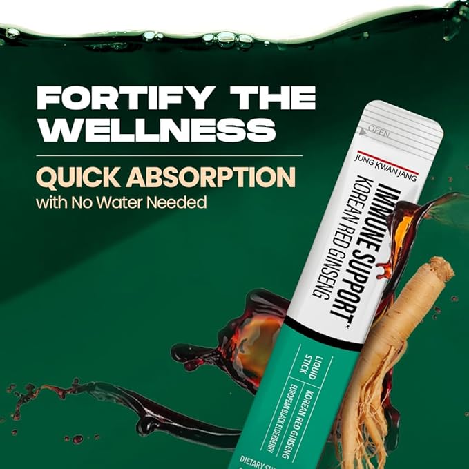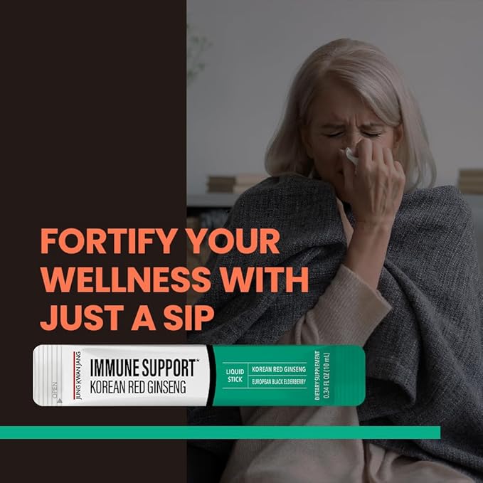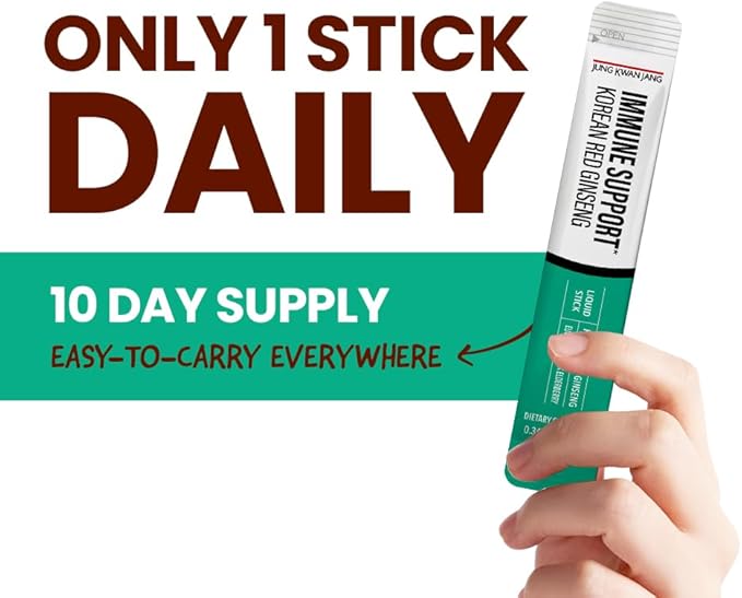 - Contains an effective dosage of elderberry, which is rich in vitamin C, antioxidants, and known for their immune-boosting properties. Additionally, it is infused with high-quality Korean Red Panax Ginseng, renowned for its ability to support the immune system and combat fatigue. By harnessing the benefits of these natural ingredients, our JungKwanJang Immune Sticks offer a comprehensive approach to enhancing your immune health and fighting off tiredness and exhaustion.