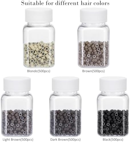 - Complete accessories: you will receive a hair extension tools kit that includes: 2500 micro silicone link ring beads (500 each in black, brown, dark brown, light brown and blonde), 1 plier, 1 threader, 1 crochet hook, 10 curved hair needles, 5 metal hair clips, 1 comb, 5 rolls sewing threads, 500 colorful rubber bands and 500 black rubber bands. The hair extension kit is enough to meet your needs.