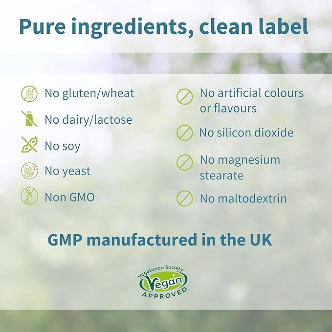 - PURE & CLEAN: tested for heavy metals, lab-verified ingredients, no unpleasant fillers (silicon dioxide, magnesium stearate or titanium dioxide), GMP manufactured in the UK, recyclable & BPA-free, vegan