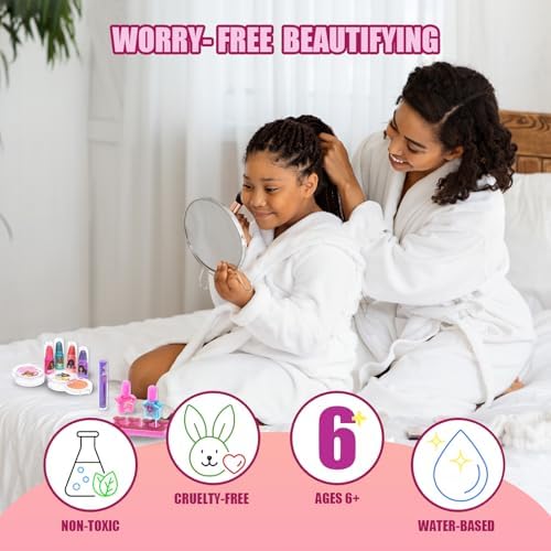 - MADE FOR CHILDREN AGES 6 AND UP : Our Make up Set (Lip Gloss, Lip Balm, Eye Shimmer, Cheek Shimmer and Brushes.) are Carefully Designed for Girls Ages 6+. Our non-toxic and water-based formulas make our lip glosses, shimmer and Nail File safe for girls aged 6 years and older. They are non-messy as they wash out with water.