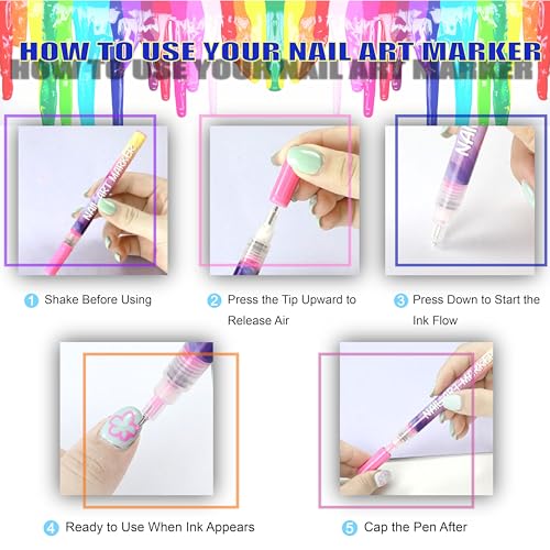 - Easy to Use: This nail polish pen set is perfect for both nail art enthusiasts and professional manicurists looking to elevate their designs. With fine tips and a smooth paint flow, these nail art pens set make it easy to create precise, intricate designs with minimal effort. Simply shake the pen to mix the ink evenly, then press the tip vertically a few times to start the flow. Effortless nail art at your fingertips!