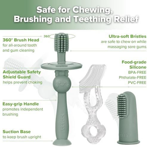 haakaa Training Toothbrush Set Oral Care Kit, Soft Silicone Toothbrush for Baby, Infants, Toddlers & Kids, Pea Green