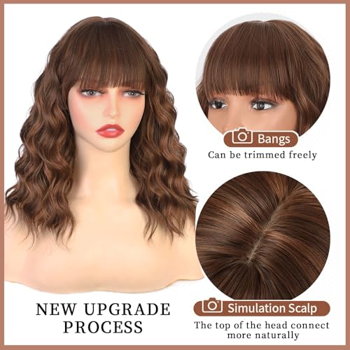 Lativ Brown Highlight Wigs for Women Short Wavy Curly Bob Wig with Bangs Shoulder Length 14 Inches Synthetic Hair for Daily Party Use