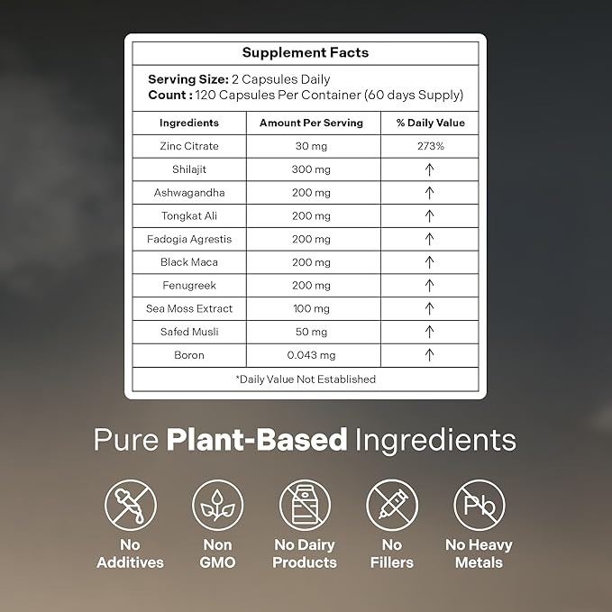 - Primary Supplement Type : shilajit, ashwaghanda, tongkat ali, black maca, fadogia agrestis, boron, zinc nitrate, sea moss, safed muslishilajit, ashwaghanda, tongkat ali, black maca, fadogia agrestis, boron, zinc nitrate, sea moss, safed musli