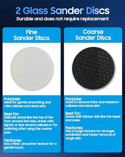 - 2 PCS Glass Sander Discs: Come with 1 fine Glass Sander Discs and 1 coarse Glass Sander Discs.It is more durable than sandpaper disc and does not need to be replaced,interchangeable coarse and fine Glass Sander Discs sheets offers increased flexibility,efficiency,and personalized care,making foot maintenance more convenient and effective