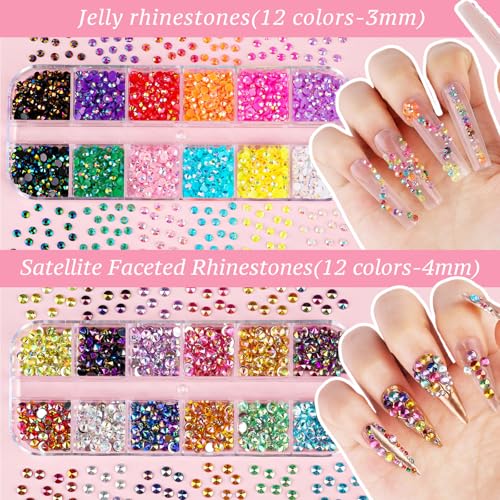- 48 Styles Sparkling Nail Gems and Rhinestones: The 12-color 2mm rhinestones are small and lightweight, with 3D colorful jelly rhinestones, easily handle a variety of complex nail art designs, perfect for dopamine nail art style. Unique design of horse eye rhinestones and satellite rhinestones breaks the monotony of traditional flat nail art design, and its exquisite cutting process makes each gems exude a charming light, perfect for daily nail art DIY.
