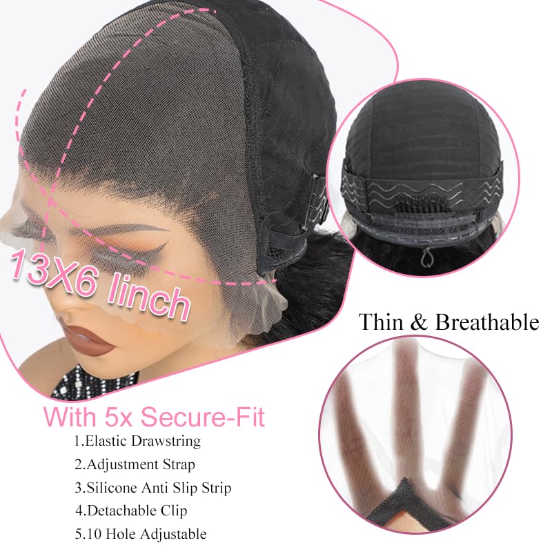 - 3.Deep Wave Human Hair Wigs Upgrade Cap Design: Gluless Deep Wave 13x6 Lace Front Wigs Human Hair With 5x Secure-Fit Cap, Elastic Drawstring For Easy Push And Pull, Fits All Head Sizes(18-24inch), Movable Elastic Belt Enhance Stability And Security.10 Hook Straps Instantly Adjust The Entire Head Circumference For Ultimate Snugness,Especially Accommodating Smaller Sizes. Combs And Anti- Slip Can Be Fixed And Prevent Back Roll. Keeping Security And Unwavering Fit During Running, Training Or Practicing Yoga.