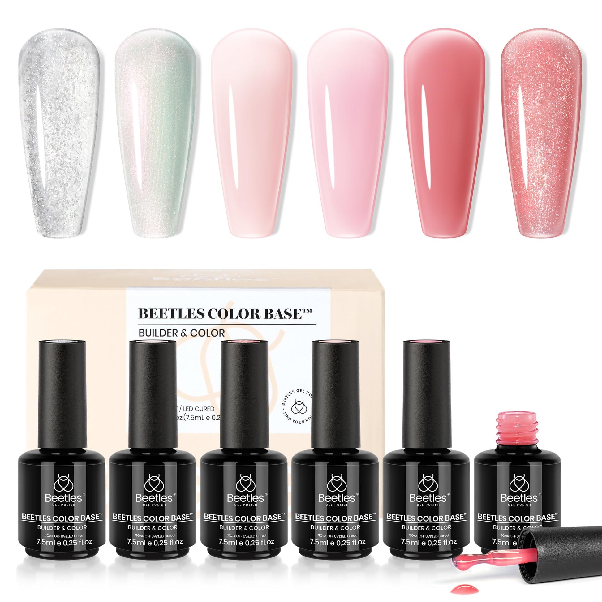 Beetles Rubber Base Gel, Nude Pink 6 Color Base Gel Polish Set, 5-in-1 Strengthening, Repairing & Smoothing Nail Base with Natural Nude Color, Self-Leveling Nail Art Manicure Gift for Women