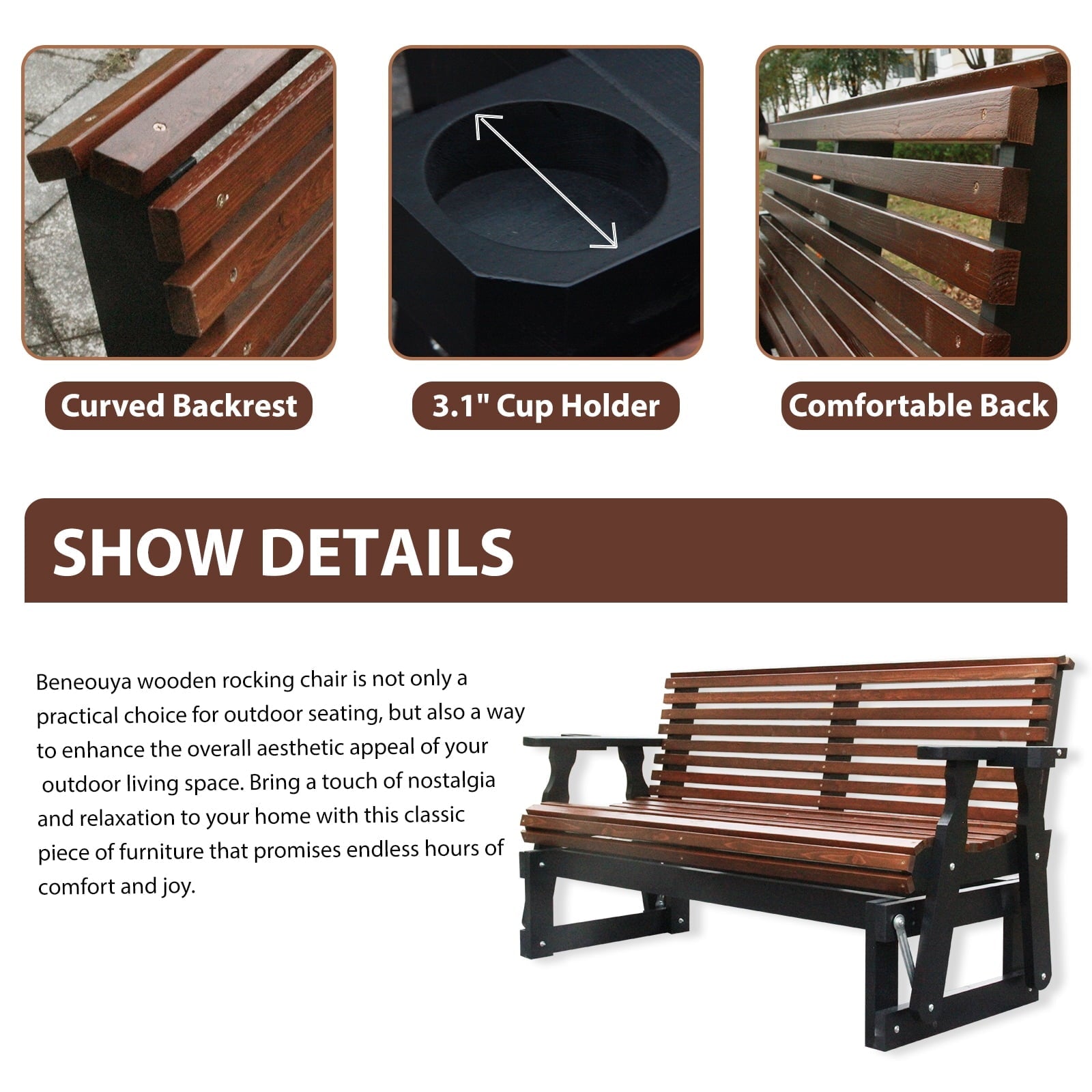 Beneouya Outdoor Glider Bench, Wooden Glider Chair with Cup Holders for Backyard, Garden Porch, Home, Dark Grey and Dark Brown