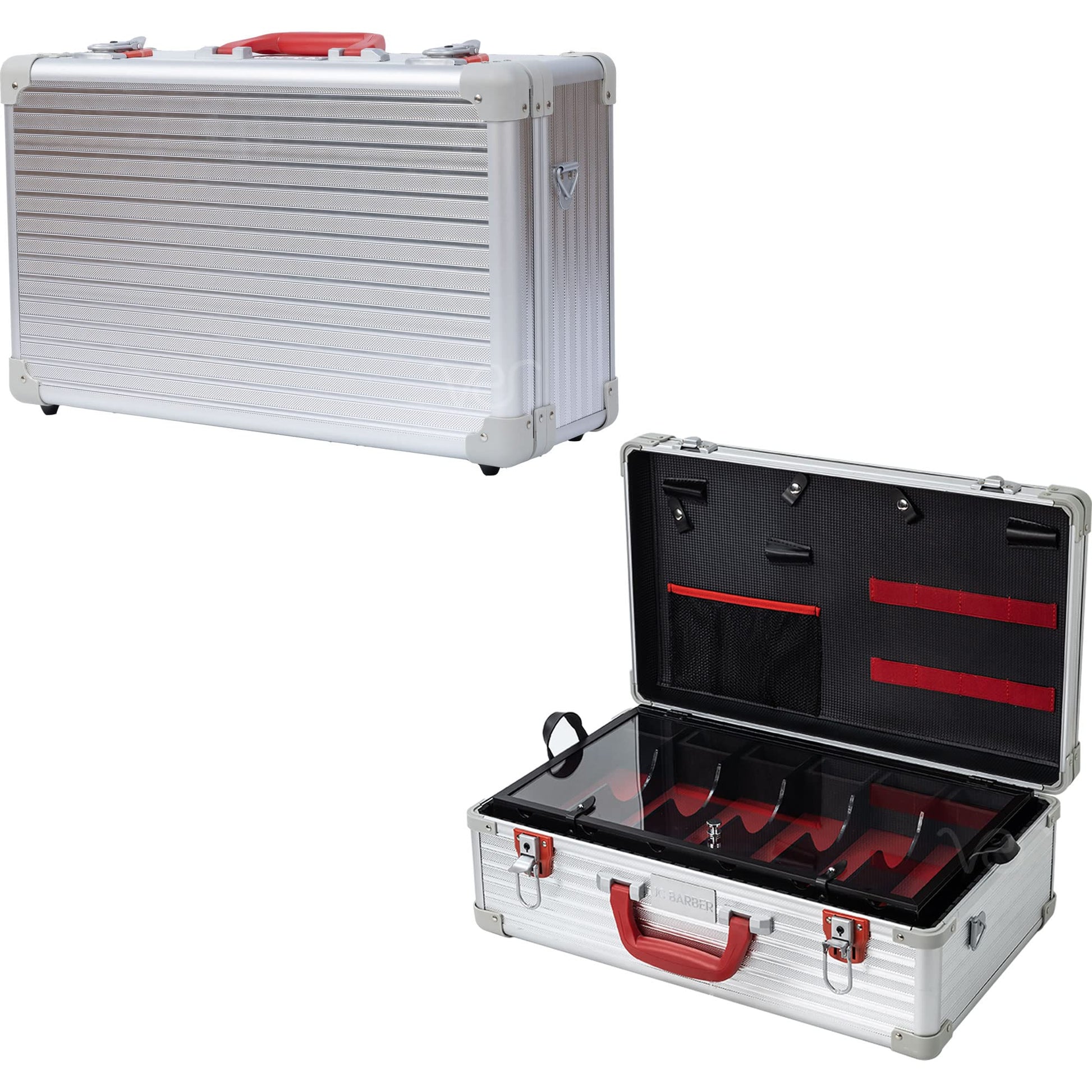 Featuring: High quality aluminum finish and construction with reinforced proprietary corners for extra durability Elegant, modern, and sophisticated inner lining This professional barber tool box includes removable trays for 6 clippers with round notches, 8 pockets with elastic band for combs and brushes, a mesh bag for accessories, and 3 shears holders under the lid. Transparent lockable lid on tray to prevent clippers shifting during transportation Heavy duty and durable self-folding pull handle Removable and adjustable shoulder strap