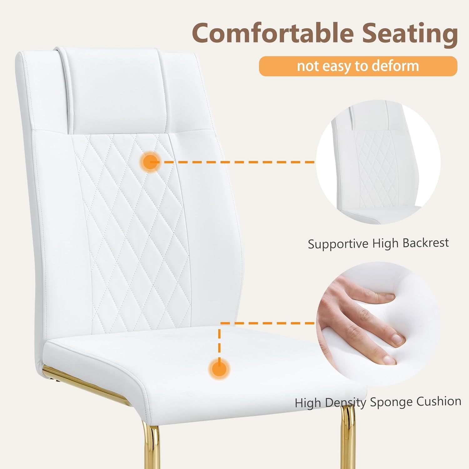 JUFU Set of 4 White Faux Leather Dining Chairs with Gold Metal Legs, Upholstered High Back Chairs for Dining Room Kitchen