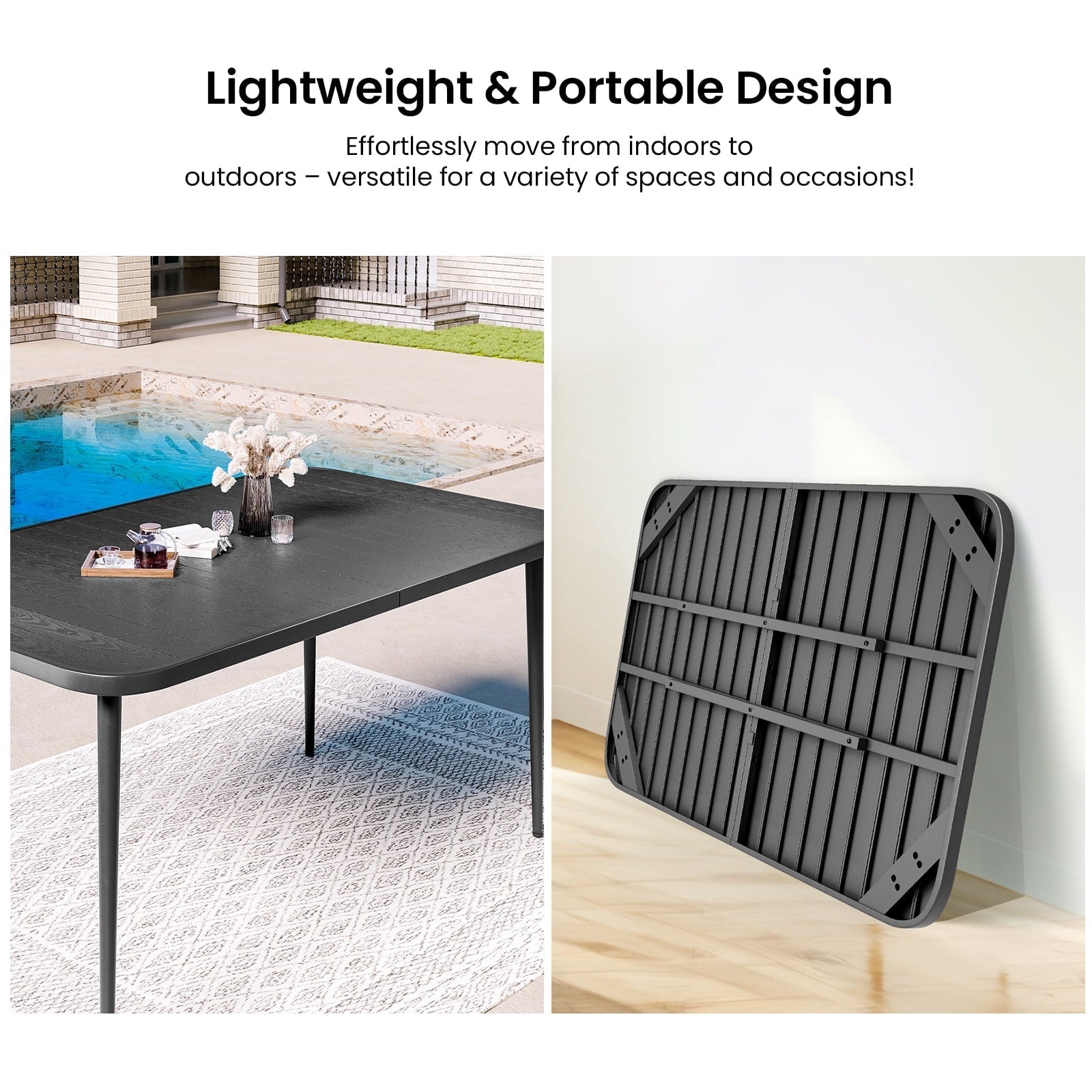 The JUSTLET 6-Person Outdoor Rectangular Metal Dining Table is built for durability and style, featuring a heavy-duty metal frame with a waterproof, sunproof, and rust-resistant coating, making it perfect for all-weather outdoor use. With a spacious 60'L x 38'W tabletop, it comfortably seats up to six people, ideal for dining or entertaining on patios, backyards, gardens, decks, or porches. The sleek slatted design not only enhances its modern look but also makes cleaning easy. Available in Black, Gray, and Brown, this all-weather table is the perfect blend of functionality and elegance for any outdoor space.