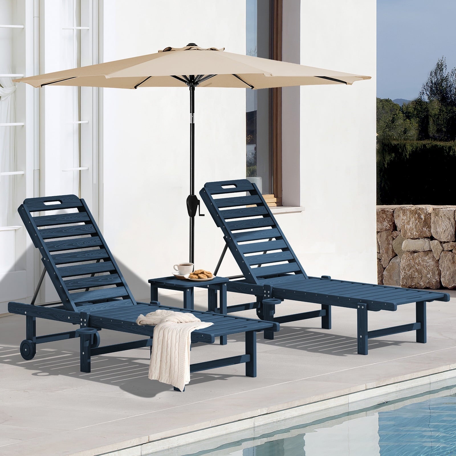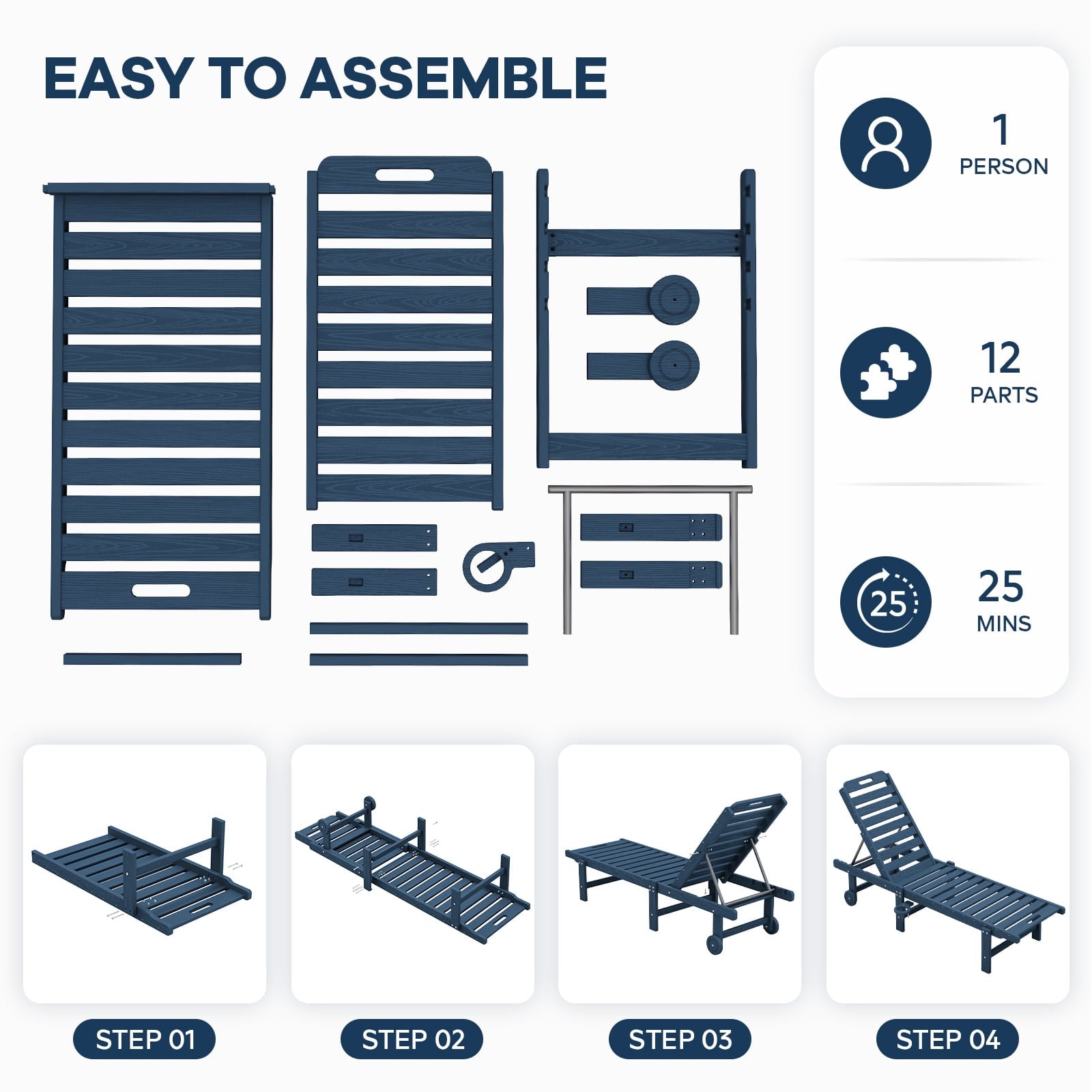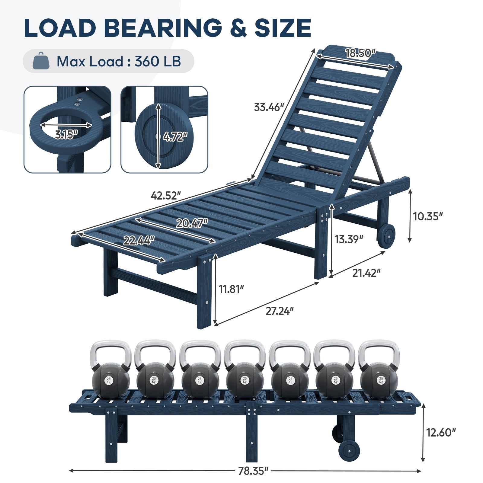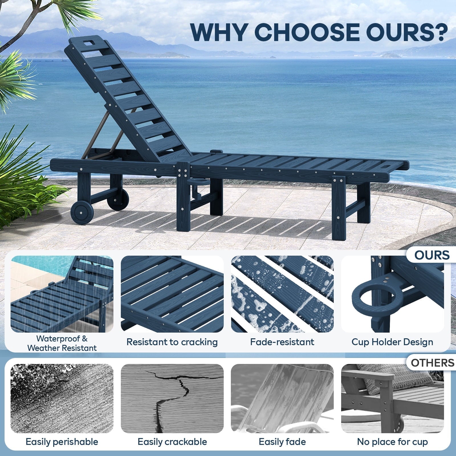 JUSTLET HDPE Outdoor Chaise Lounge Chair with Wheels & Cup Holder,5 Position Adjustable Backrest for Patio & Balcony & Garden & Poolside & Beach, Navy Blue