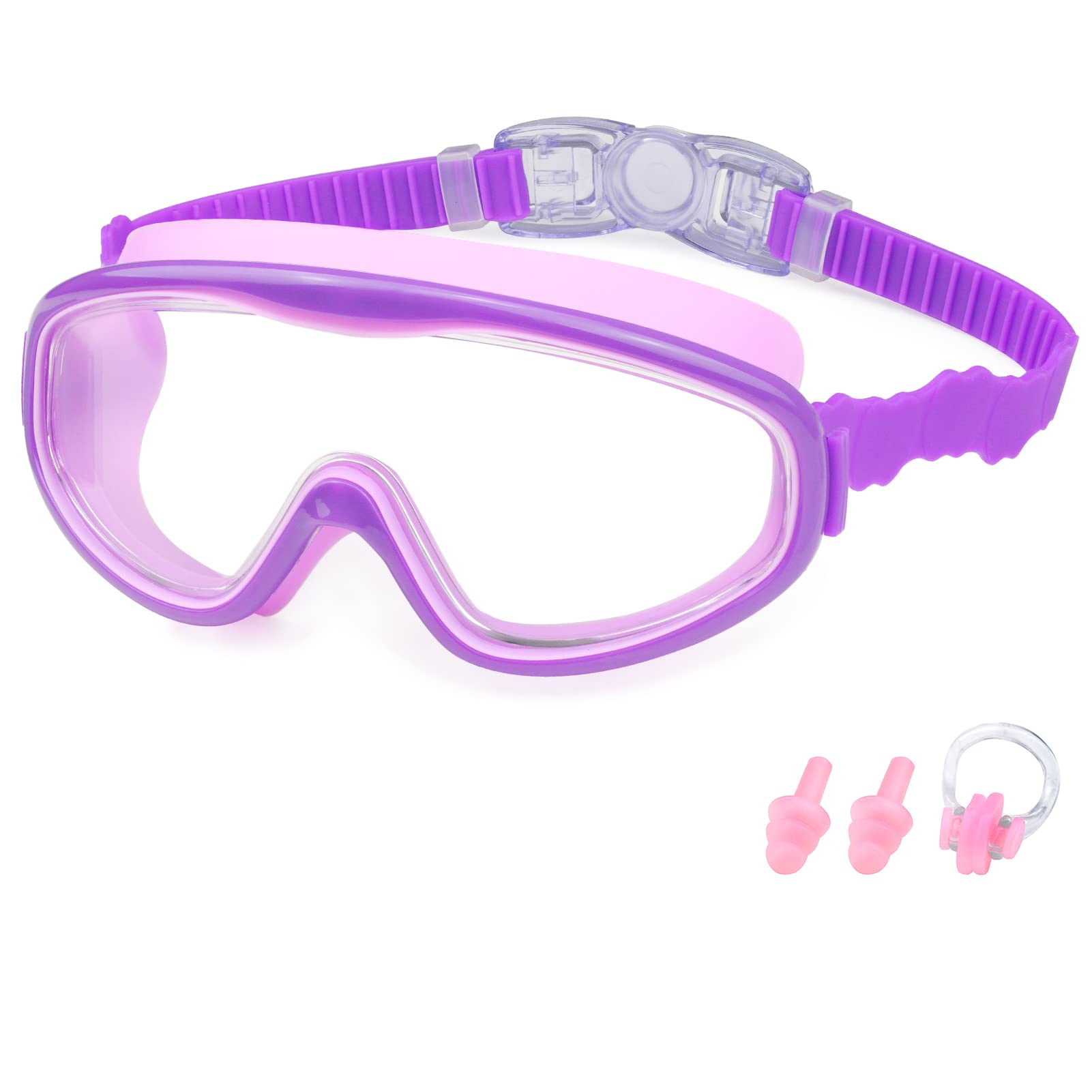 KAILIMENG Kids Swim Goggles, Clear Wide View No-Leak Anti-Fog UV Protection Swimming Glasses with Nose Clip Earplugs for Toddlers Youth Child 3-15 Years Old (Purple)