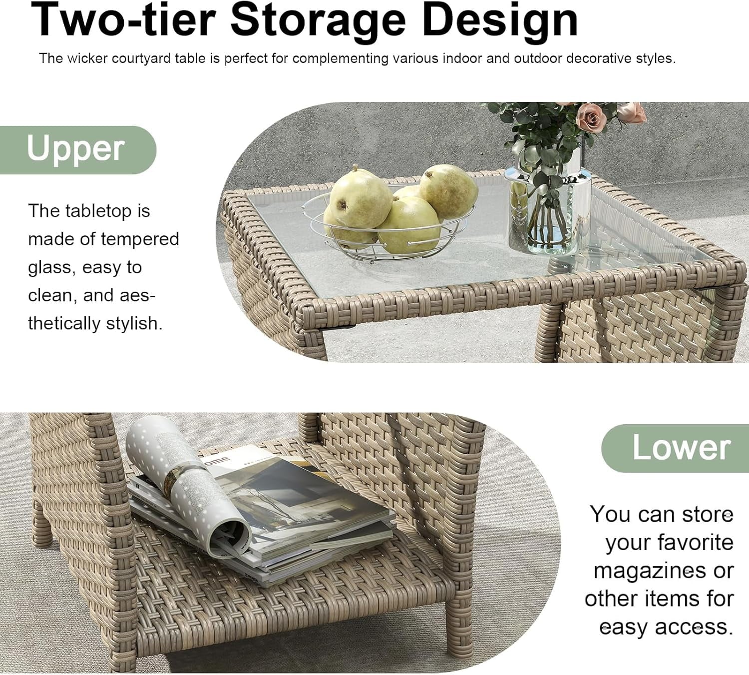 Kinbor Wicker Rattan Side Tea Table as the patio furniture is convenient for your outdoor needs. It is lightweight, so you can put it anywhere you want indoors or outdoors. It goes great with most wicker furniture and provides you comfort and convenience. Featured with a useful lower table, you can store your magazines or clutter. With a 5mm glass top, the side table is perfect for serving coffee, wine, snacks and fruits. Kinbor table furniture is your ideal companion to improve your quality of life.