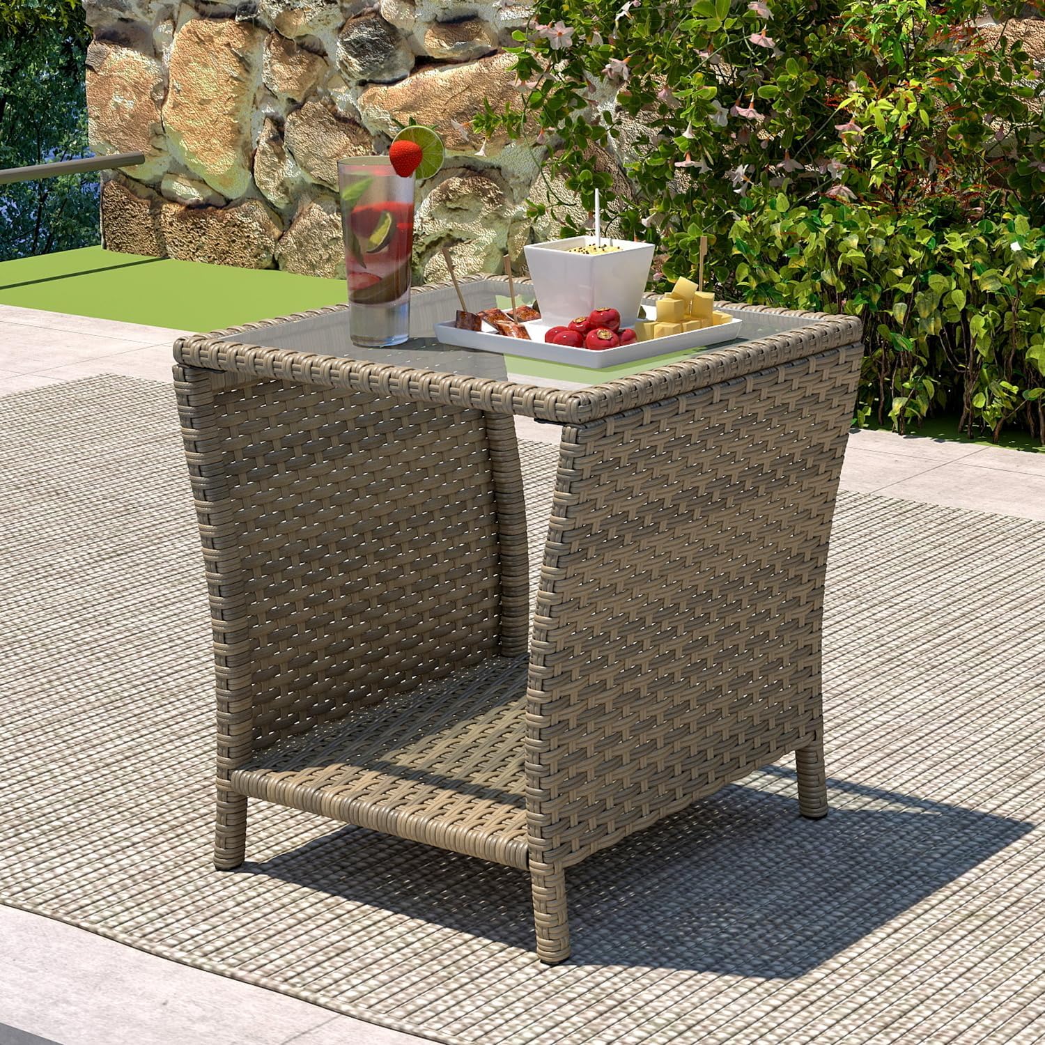 Kinbor Small Patio Table, Tempered Glass Top Outdoor Wicker Side Table with Storage Shelf, Durable PE Rattan & Iron Frame, Mixed Dark Brown