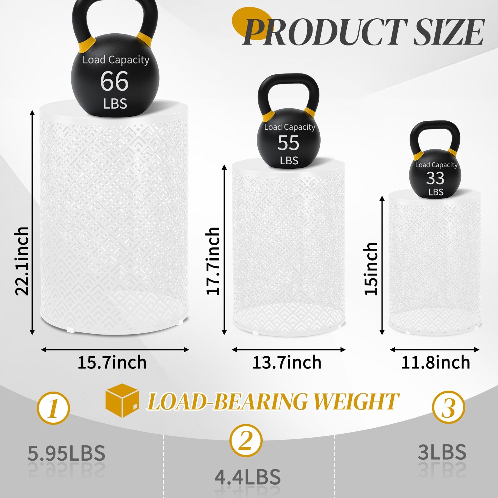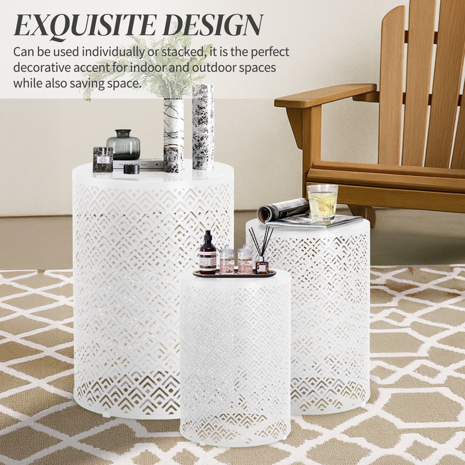 Elevate your space with this versatile 3-Piece Table Set of Nesting Side Tables! Perfect as Outdoor Accent Tables or indoor Metal End Tables, this set includes three distinct heights (12', 14', 16'H) crafted from high-quality, rust-resistant metal. Their durable white finish ensures long-lasting beauty on your Patio Side Table Set or balcony, garden, living room, or bedroom. The elegant metal cutout design creates stunning light and shadow patterns, adding chic style. Stackable Side Tables for compact storage, they're incredibly lightweight and portable, yet sturdy enough for daily use. Effortlessly clean the smooth surface of these White Metal Tables with just a damp cloth. Functional, decorative, and built for any environment!