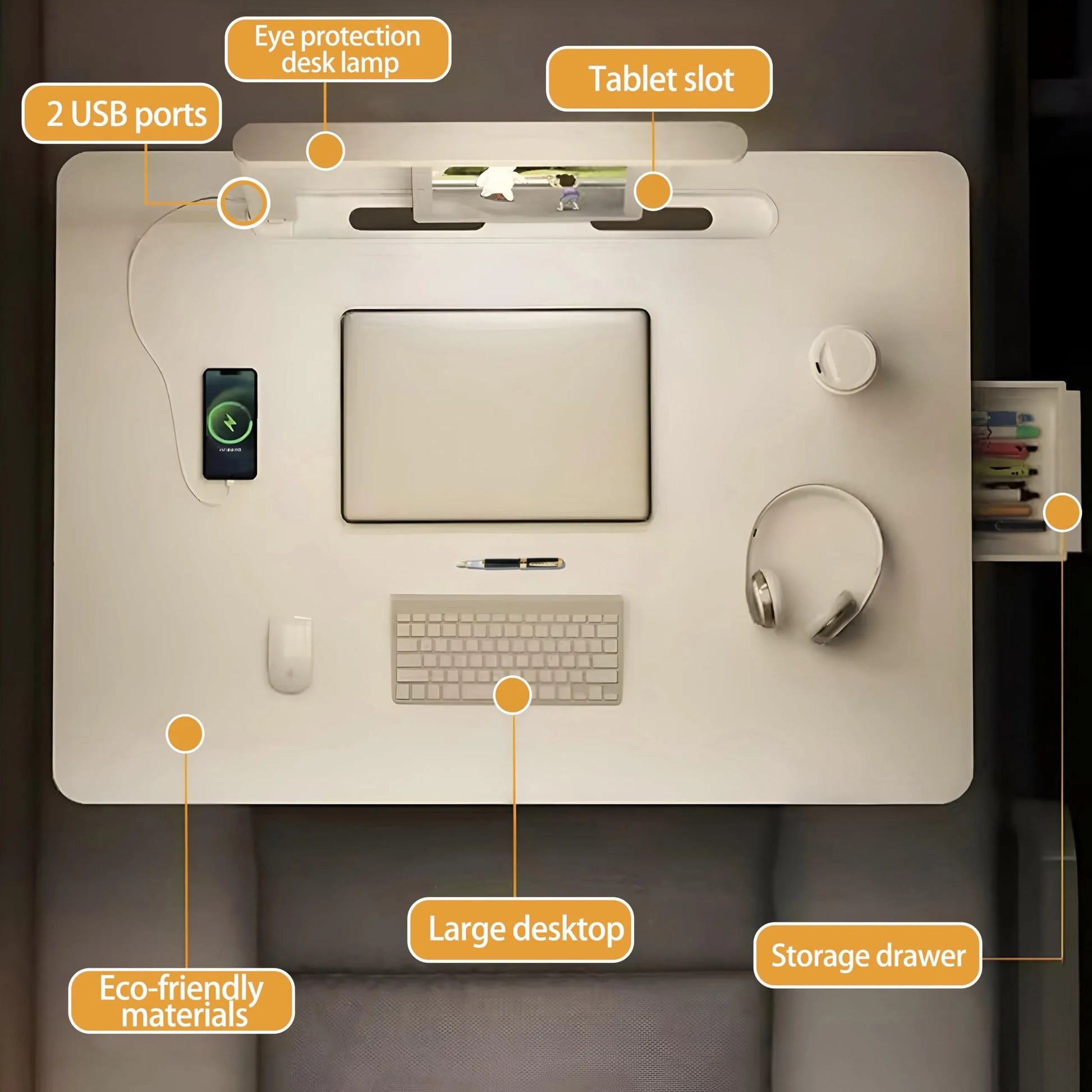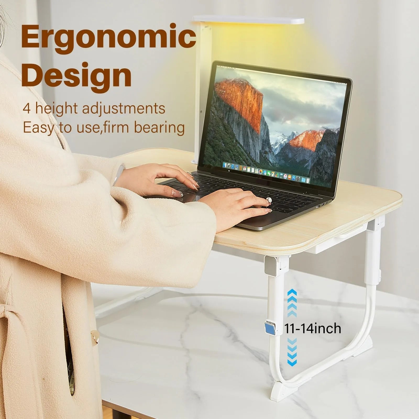 This laptop desk for bed features a built-in LED light for optimal visibility and productivity. Improve your posture while working from bed with the adjustable height and tilting surface. Perfect for students, professionals, and anyone looking to work comfortably from their bed.