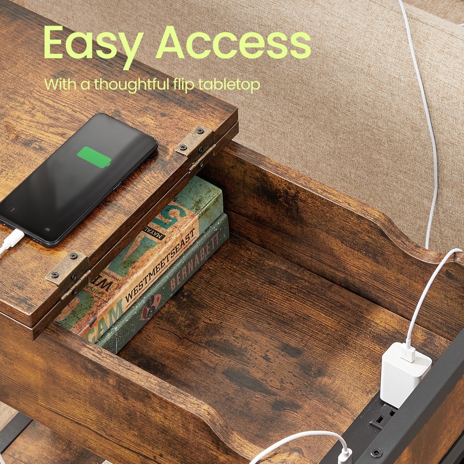 Upgrade your space with this functional 2-piece set of charging side tables that combine smart organization with modern convenience. Each table features a versatile charging station (2 AC outlets + 2 USB ports) with strategically spaced 4.9ft cords to power multiple devices simultaneously. The innovative design includes both open shelving and hidden flip-top storage, complemented by three sized fabric organizers (9.1' large, 9.1' medium, and small bottom bags) for perfect item categorization. Thoughtful details like cord management grooves and a side-mounted power strip maintain a clutter-free look. Measuring 23.6' tall, these rustic brown tables with black steel legs effortlessly blend into bedrooms, living rooms, or any tight space needing both style and function.Material: Steel Frame, Particleboard, Fabric BagSize of Each Table: 23.6βD x 12.4βW x 23.6βH (60 x 31.5 x 60 cm)Size of Power Strip: 2βD x 5.1'W (5 x 13 cm)Cord Length: 4.9 ft (150 cm)Weight of Each Table: 23.4 lb (10.6 kg)Max. Static Load of Each Table:Max. Static Load of Tabletop: 22 lb (10 kg)Max. Static Load of Storage Compartment: 22 lb (10 kg)Max. Static Load of Bottom Shelf: 33 lb (15 kg)