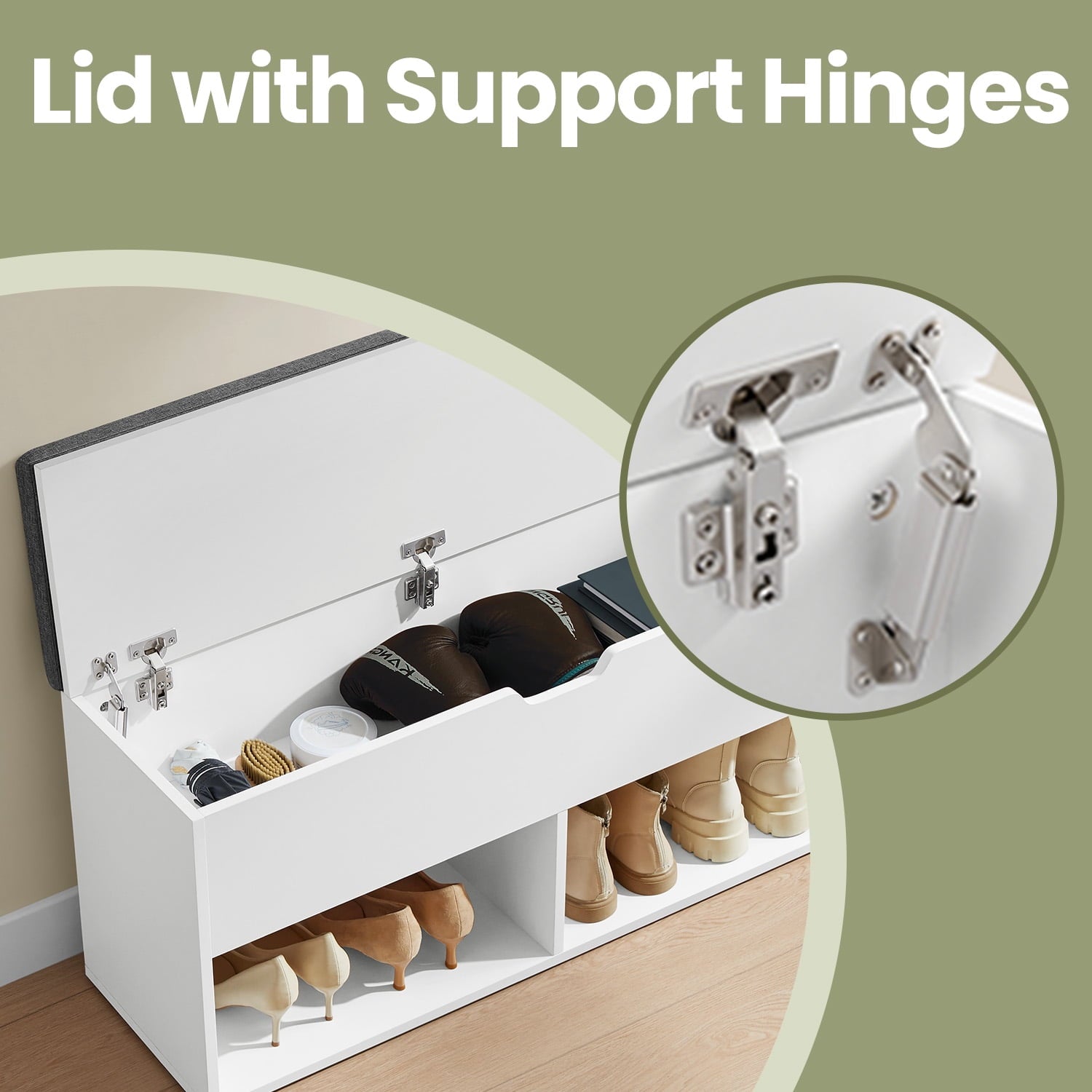 Upgrade your entryway with this multifunctional shoe bench featuring smart storage solutions and comfortable seating. The spacious 39.4-inch wide design offers two open shelves for daily footwear and a deep 7' hidden compartment for pet supplies or seasonal items. Enjoy added convenience with the removable padded cushion (secured by hook-and-loop fasteners) that simplifies cleaning while providing comfortable seating (300lb capacity). Safety-enhanced with slow-close hinges and a front cutout for easy access. Perfect as a bedroom seat, living room organizer, or mudroom essential in versatile white and gray tones.Material: Particleboard, Foam, Linen FabricProduct Size: 11.8'D x 39.4'W x 18.9'H (30 x 100 x 48 cm)Product Weight: 36.3 lb (16.5 kg)Max. Static Load Capacity: 300 lb (136 kg)