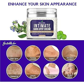 - Our skin cream for dark intimate areas can be safely applied on the face, body, bikini, thighs, and sensitive areas to give your skin the support it needs