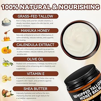 - 【Whipped Tallow & Honey Balm】- Experience the light, airy texture of our tallow and honey balm. Made with organic grass fed beef tallow, raw honey, and beeswax, it melts into your skin for deep hydration. Free from harsh chemicals, it provides gentle, all-natural care.